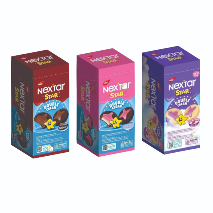 Nextar Star adalah Biscuit Cokelat dengan Krim cokat/ krim strawberry vanilla berbentuk bintang di bagian tengah.