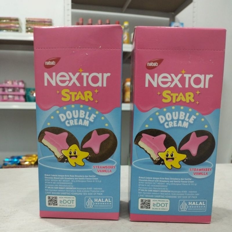 Biscuit coklat dengan krim strawbery vanilla Produksi Nabati. 1 kotak isi 8 pieces biscuit.