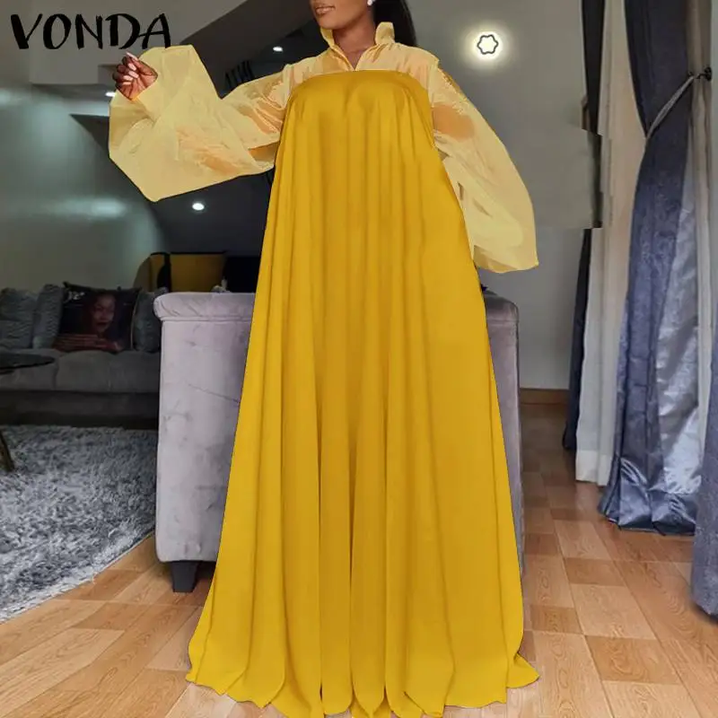 VONDA Women Party Maxi Dress Autumn Puff Sleeve V Neck Pleated Long Vestidos Ladies Casual Solid Party Robes Longue Oversized