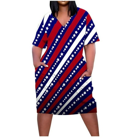 YanHoo Women s Plus Size Dresses Independence Day Print Pockets T-shirt Dress Short Sleeve V Neck Casual Dress