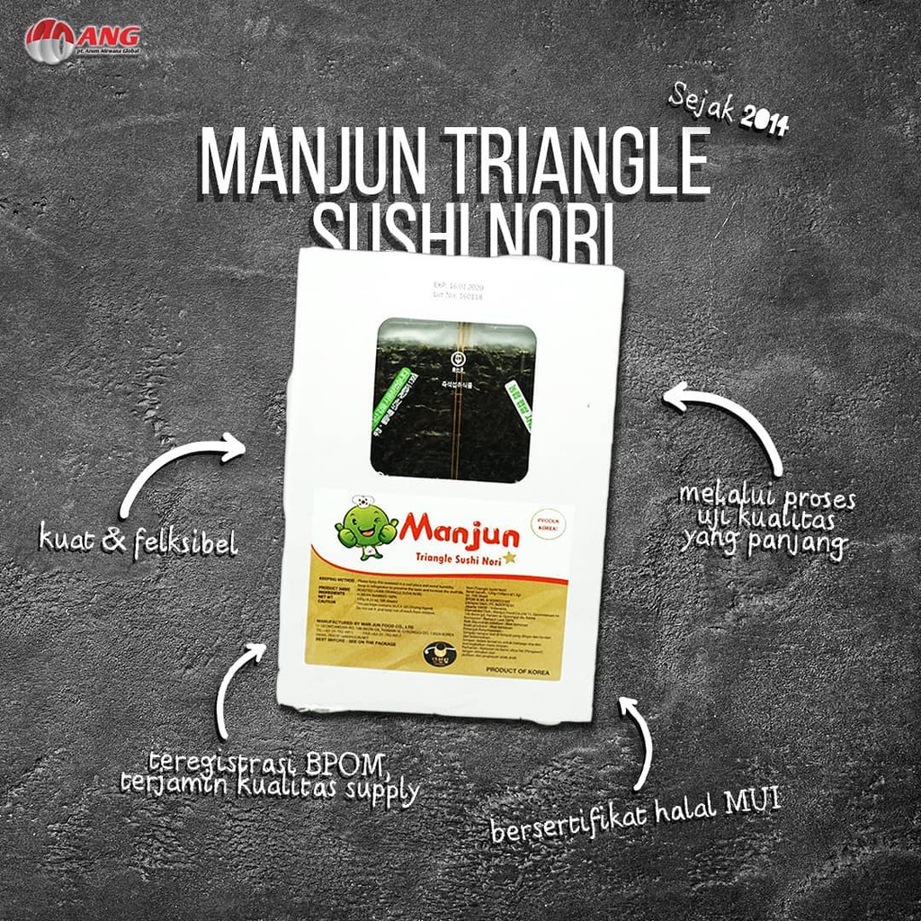 Nori Manjun Triangle 100 Lembar adalah nori yang digunakan untuk membuat onigiri atau nasi kepal Jepang.