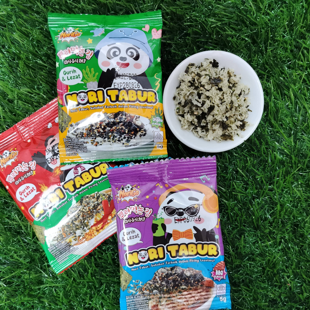 NoriGo menghadirkan Nori Tabur dengan potongan rumput laut panggang, dengan taburan rice noodle, biji wijen, bawang merah dan minyak wijen yang digunakan sebagai taburan toping pelengkap nikmat makanan lezatmu.