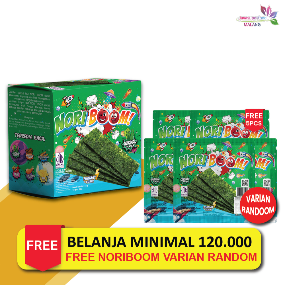 Nori Boom Merupakan cemilan rumput laut dengan kulit lumpia. Nori Cemilan rumput Laut cocok untuk dijadikan teman ngemil untuk beraktivitas, Seperti menonton TV, Belajar dan Bersantai