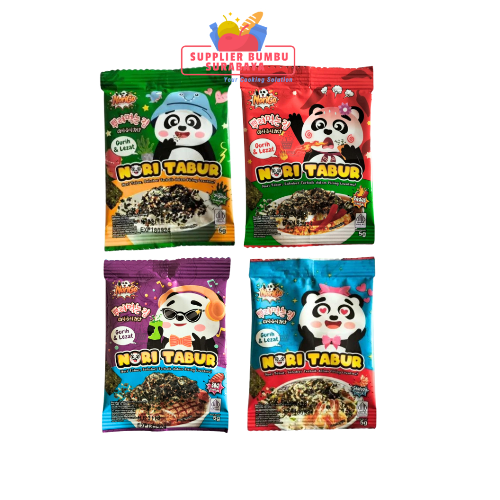 Norigo Tabur merupakan potongan rumput laut panggang, dengan taburan rice noodle, biji wijen, bawang merah, dan minyak wijen yang digunakan sebagai taburan topping pelengkap nikmat makanan anda