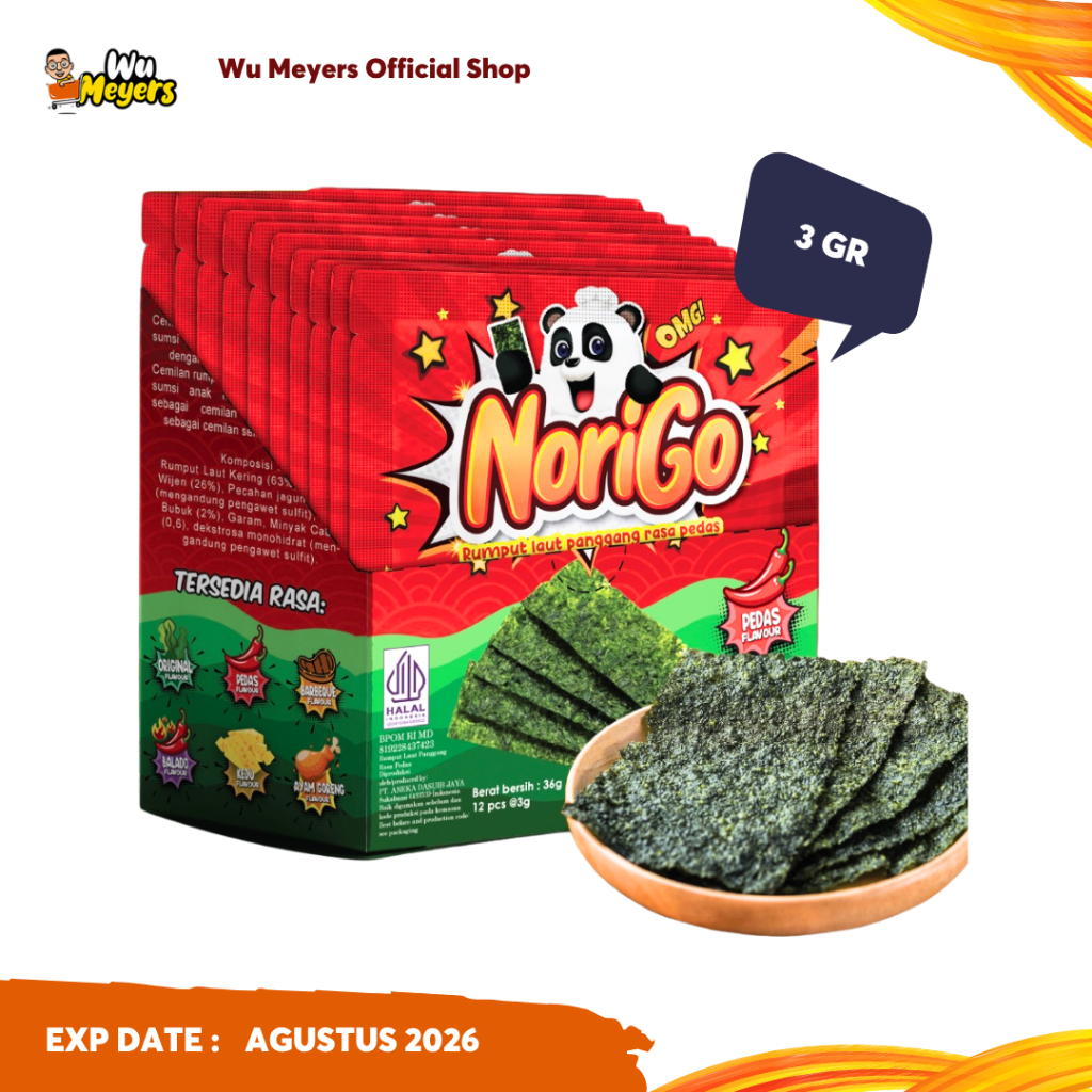 Norigo Cemilan Rumput Laut Halal adalah nori crispy yang terbuat dari bahan-bahan yang berkualitas serta memiliki rasa yang enak dan lezat. Norigo merupakan cemilan rumput laut dengan kulit lumpia. Nori cemilan rumput laut cocok untuk dijadikan teman ngemil untuk beraktivitas, seperti menonton TV, belajar dan bersantai