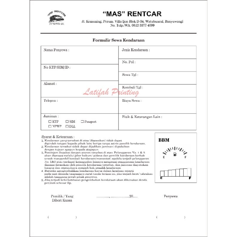 Nota Rental Kendaraan / Nota Sewa / Nota Rental Custom