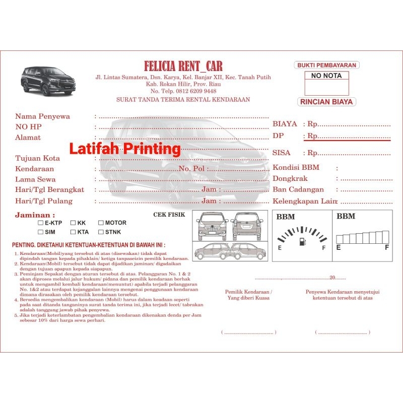 Nota Rental Mobil / Nota Sewa Custom