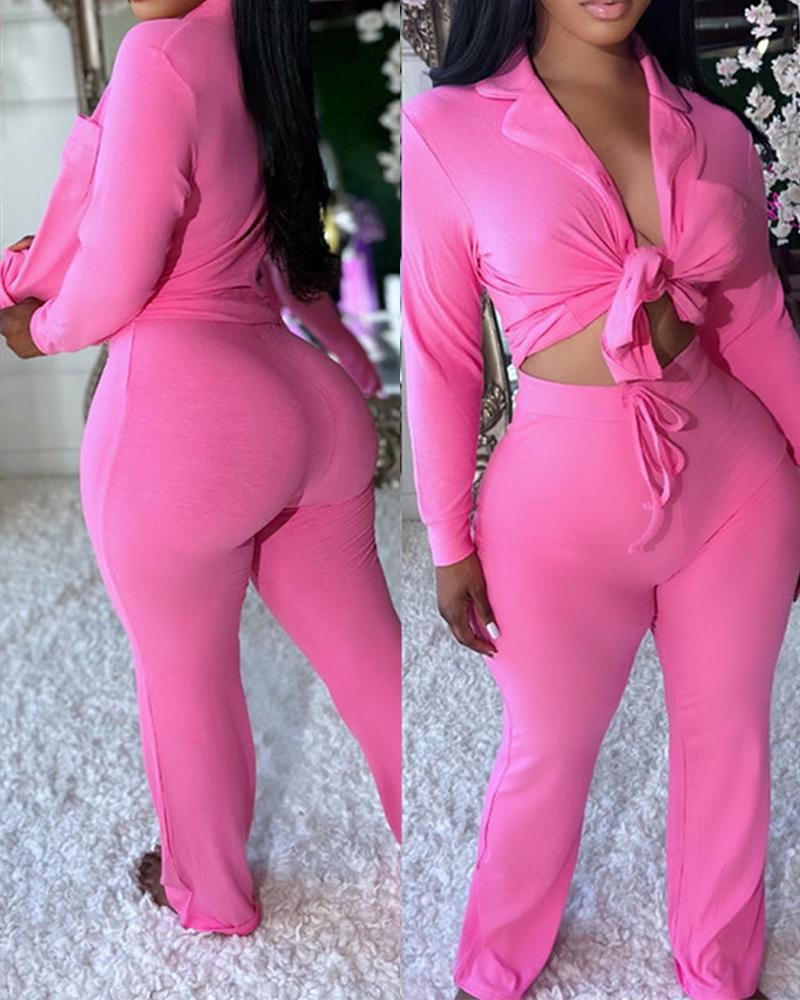 Notched Collar Buttoned Top & Drawstring Pants Set, Pink