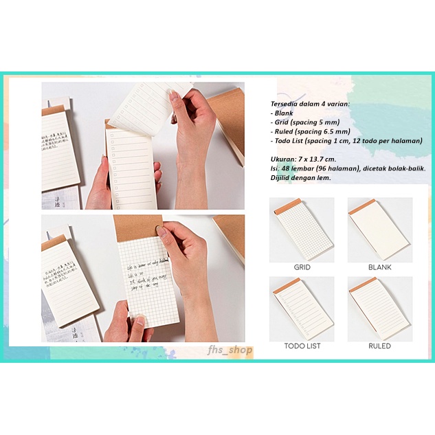 Jangan ada yang kelupaan! Dengan memo kecil ini selalu di saku, niscaya tidak ada hal penting yang terlewat olehmu. Catat daftar belanjaan, rangkuman materi, tugas, maupun sekedar doodling pengisi waktu. Memo mungil dengan tampilan minimalis ini memiliki 4 pilihan format kertas: polos, bergaris, kotak, dan todo-list. Notebook lucu ini juga bisa dijadikan ide barang lucu untuk kado lucu atau kado aesthetic buat sahabatmu