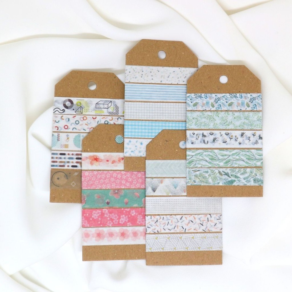 Dalam 1 pc kartu ini kamu udah bisa dapet 5 washi tape dengan total panjang 1.5 m ya, patternya juga baguss.