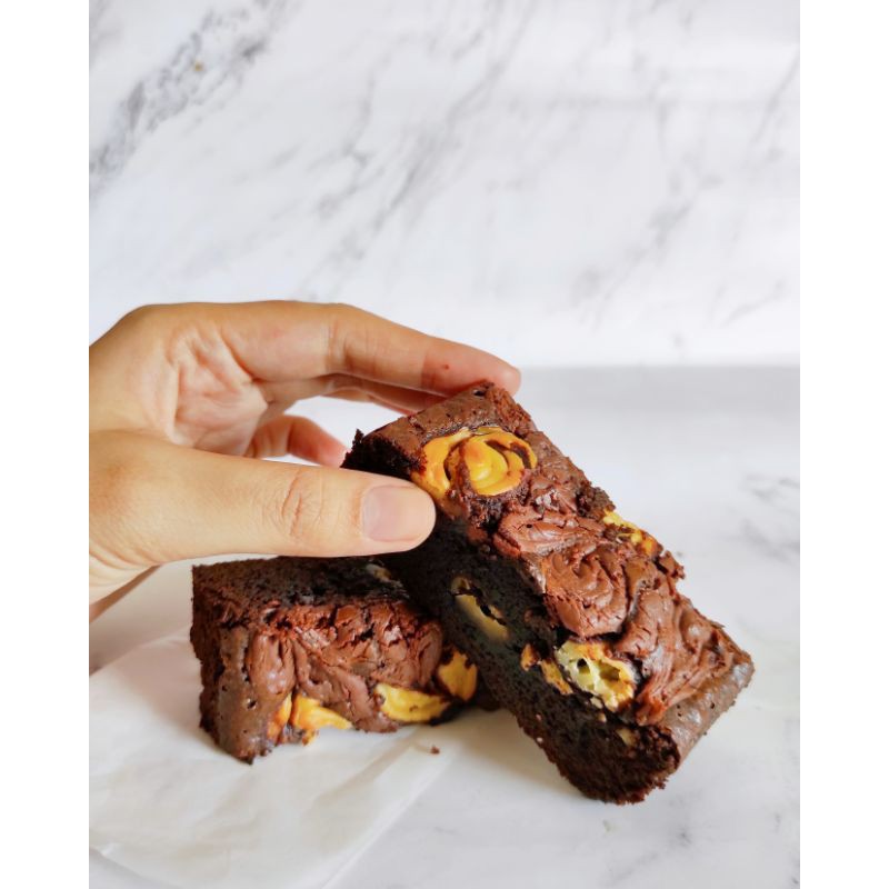 Premium Brownies dengan topping Nutella dan Cream cheese menggunakan butter premium, dark chocolate premium, cocoa powder terbaik.