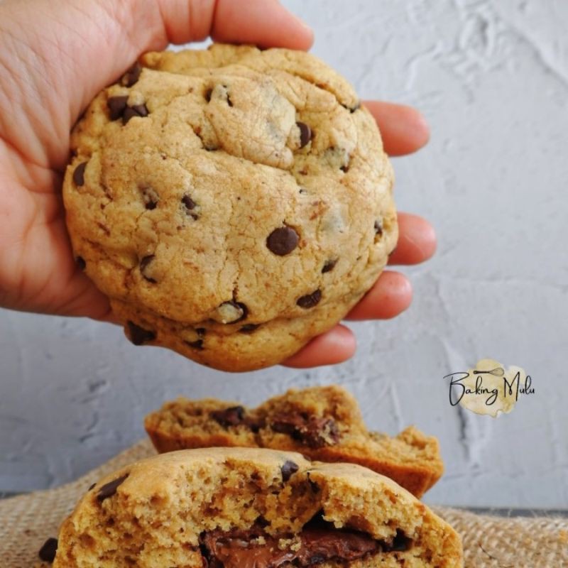 Homemade soft cookies gurih/buttery ukuran besar setelapak tangan dengan choco chip dan nutella filling. Tentunya tidak terlalu manis. Renyah di luar tapi lembut di dalam.