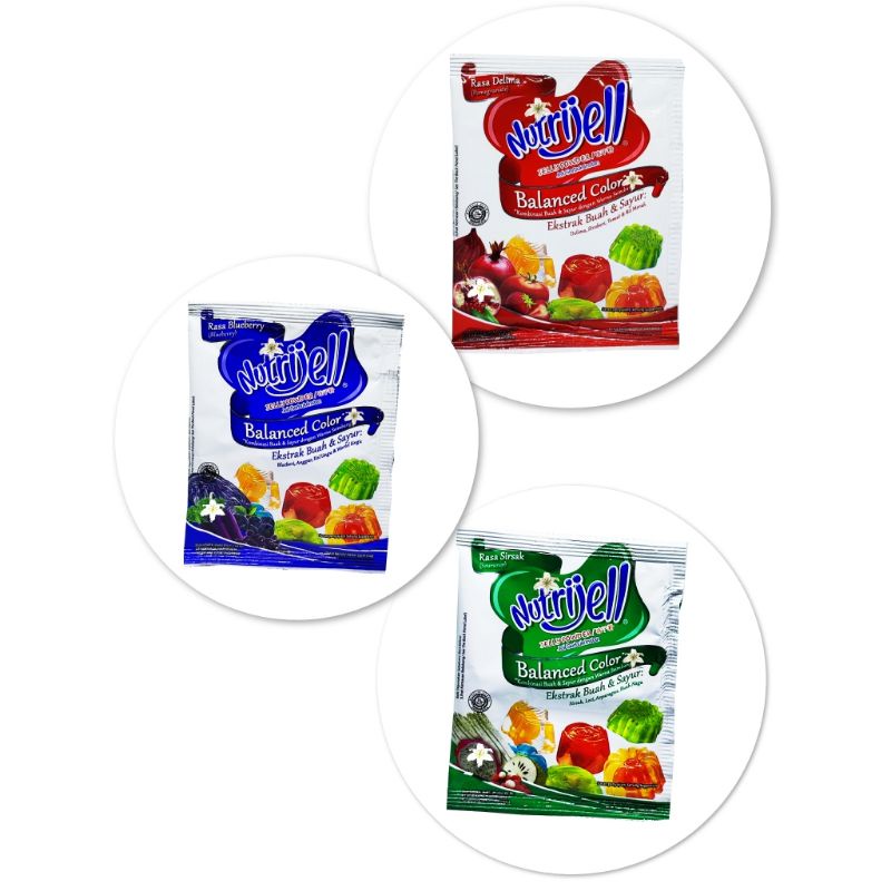 Nutrijell dengan varian balanced colour yang mengandung bahan-bahan dari ekstrak buah-buahan dan sayuran yang sangat sehat untuk pencernaan.