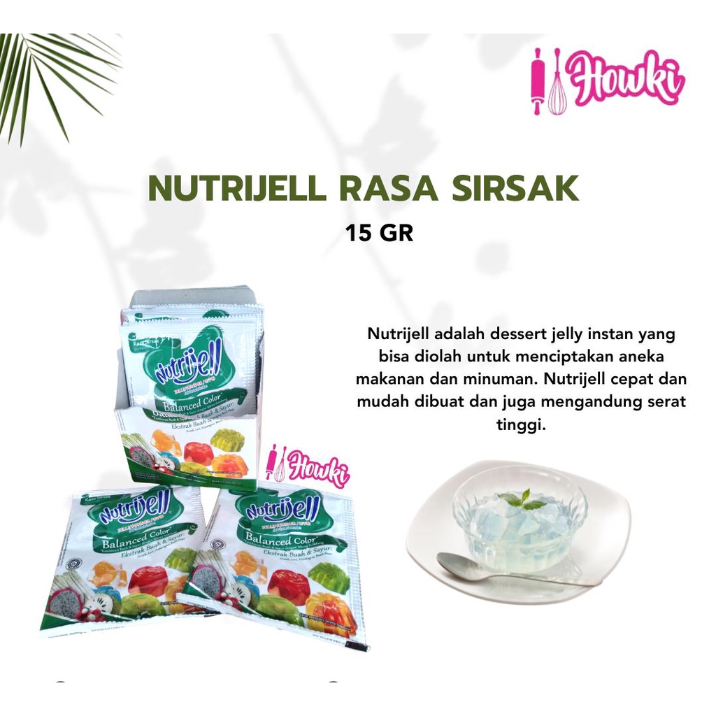 Nutrijel rasa sirsak memang kayak ekstrak buah dan sayur. selain itu biasanya buat kresi jelly art . warna bening .. disarankan pemakaian gula yang putih agar warna jelly tetap sebening kristal.