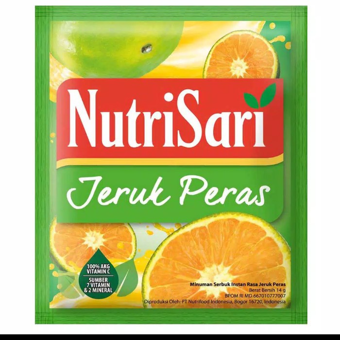 NutriSari Jeruk peras yang merupakan minuman serbuk rasa jeruk peras dengan sari buah jeruk peras yang menyegarkan. NutriSari memenuhi 100% AKG Vitamin C harianmu, juga dilengkapi dengan vitamin A, B1, B3, B6, D, asam folat dan E serta mineral kalsium & fosfor.