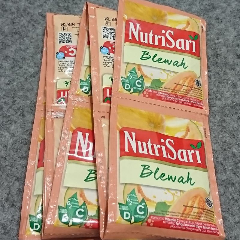 Minuman serbuk instan nutri sari rasa blewah. Dengan 6 vitamin dan 2 mineral, tinggi vitamin D, dan vitamin C 100%AKG.