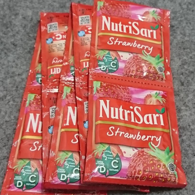 Minuman serbuk instan nutri sari rasa strawberry. Dengan 6 vitamin dan 2 mineral, tinggi vitamin D, dan vitamin C 100%AKG.