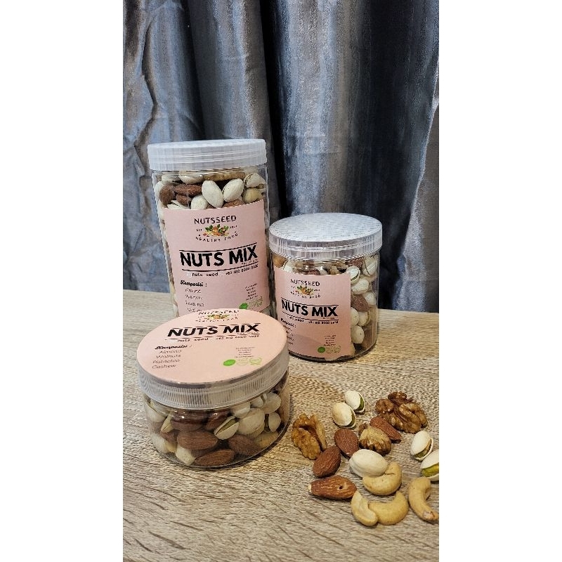 Cemilan yang terdiri dari Almond, Cashew, Pistachio, Walnuts perbandingan 1:1