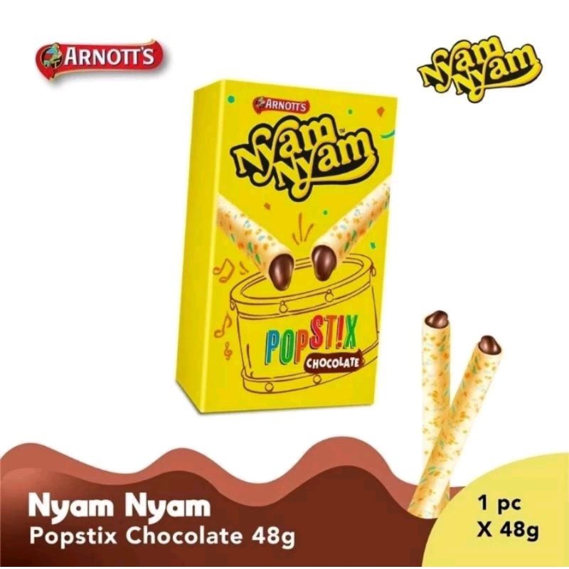 Nyam Nyam Pop Stix merupakan wafer roll dengan filling coklat yang lezat, cocok untuk kamu bawa ke sekolah atau dinikmati untuk cemilan. Jadikan hari lebih ceria bersama Nyam-Nyam Pop Stix