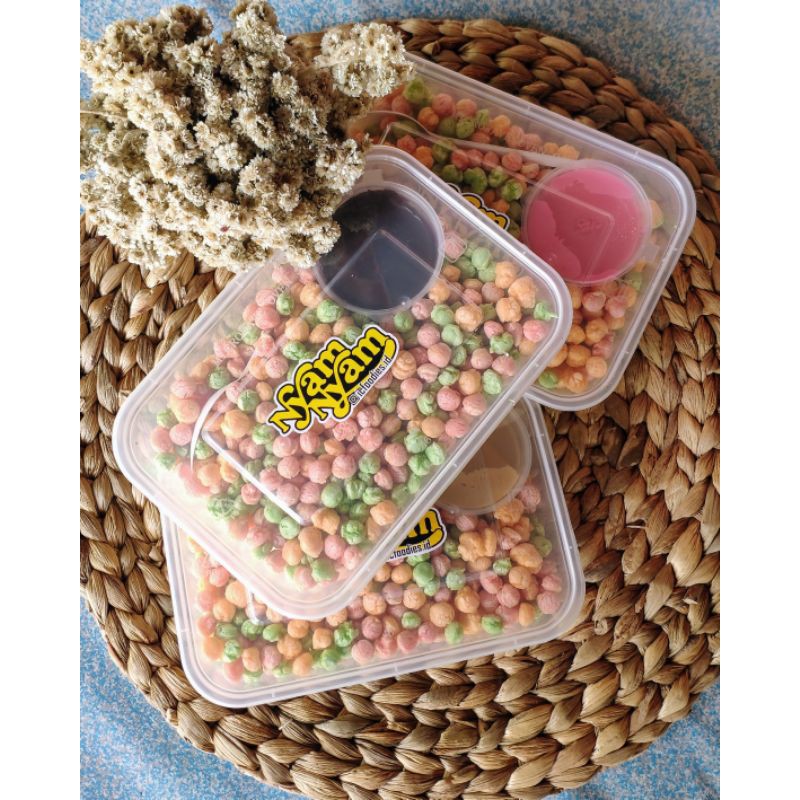 Nyam-nyam crispy rice kesukaan semua usia. Ada varian cocolan cokelat, strawbery, tiramisu dan greentea.