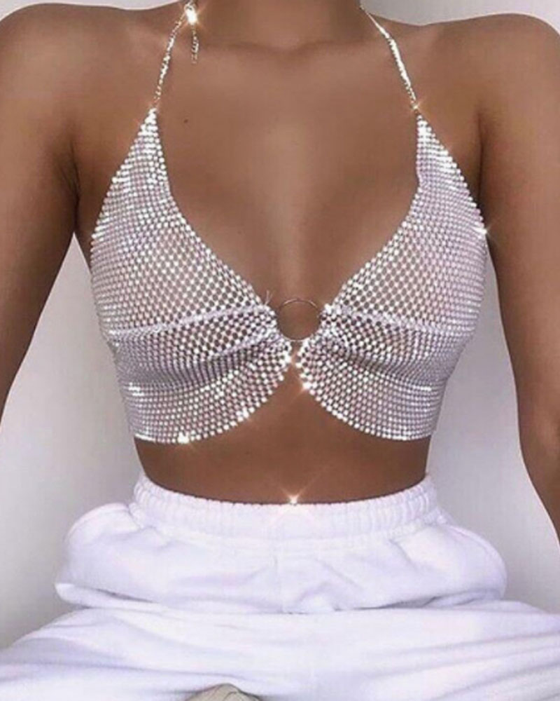 O-Ring Link Rhinestone Sequin Body Chain, White