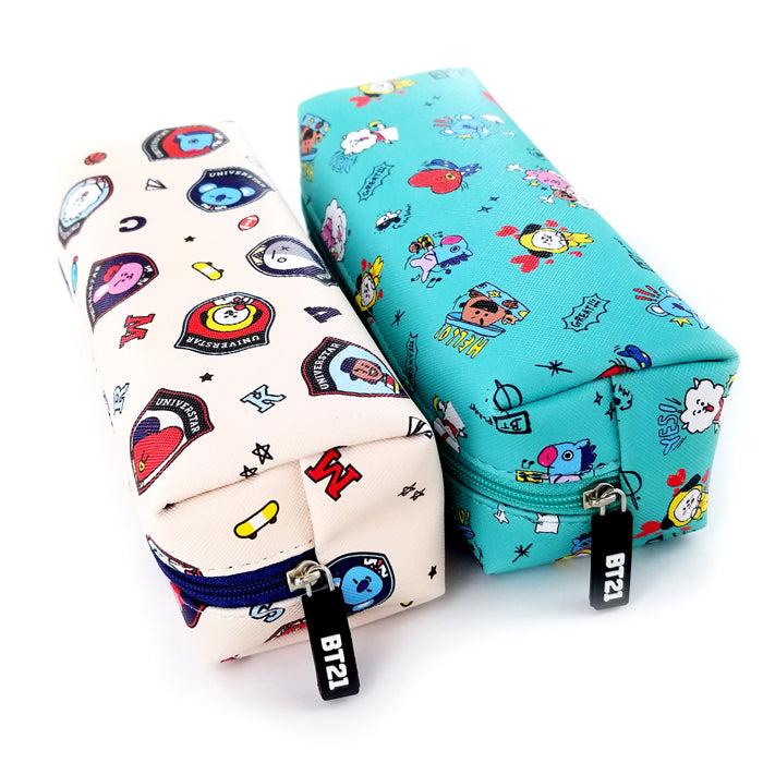 BT21 Square Pencil Case Comes in 2 designs : Blue Green w/ Blue Green Zipper , Beige w/ Navy Blue Zipper. Each pencil case has a leathery feel to their texture, a Colorful Zipper w/ Rubber BT21 Logo Handle.