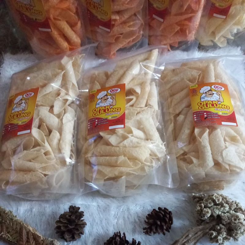 OGU (OPAK GULUNG) Terbuat dari Singkong yang berasal dari perkebunan sendiri sehingga produk dijamin selalu fresh, dengan tekstur yang renyah dan rasa yang beragam. Cocok untuk camilan keluarga di saat santai .