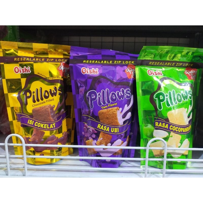 Nikmati uniknya rasa coklat dan ubi yang meresap dalam spons bulat renyah berpadu dengan rasa lembut dalam Oishi Pillows disaat santai-santai anda. Satu-satunya cemilan modern yang rasanya membuat para penikmatnya penasaran. Cemilan ini sudah menggoda hanya dengan melihat kemasannya. Spons renyah lembut yang dibuat dari jagung dan beras dilumuri dengan lelehan cokelat dan ubi yang membuatnya meresap dan terkunci dalam pori-pori spons nya. Ketika digigit lezatnya menguasai lidah anda. Dikemas dengan plastik elegan membuat rasa nikmatnya selalu terjaga