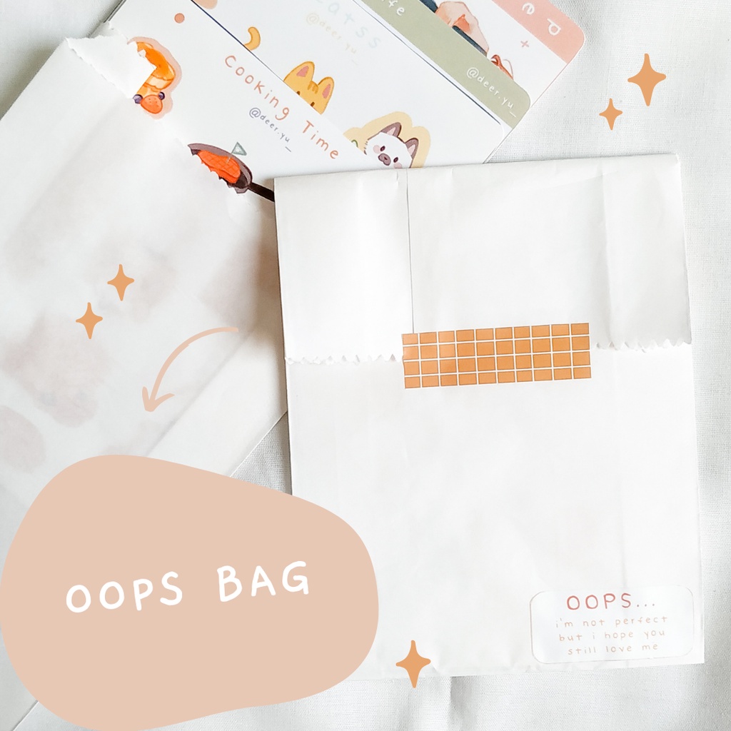 Oops bag berisikan produk2 lama kami dan produk yang memiliki cacat minor namun masih layak untuk dipakai. Contoh: sticker stok lama, sticker yang warna printnya kurang sesuai dengan yang kami inginkan, sticker sheet yang kotor (tapi tidak mengenai area stickernya), terjadi kesalahan desain pada sticker namun kondisi bagus, pop socket yang terkena sedikit lem (namun tidak terlihat jelas). Berikut adalah pilihan oops bag kami: