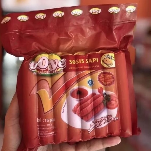 Ooye sosis sapi Isi: 15 pcs/Pack Berat: 375 gr Sosis sapi yang diolah menggunakan daging sapi pilihan dan bahan-bahan berkualitas, product telah tersertifikasi Halal dan lulus uji BPOM.