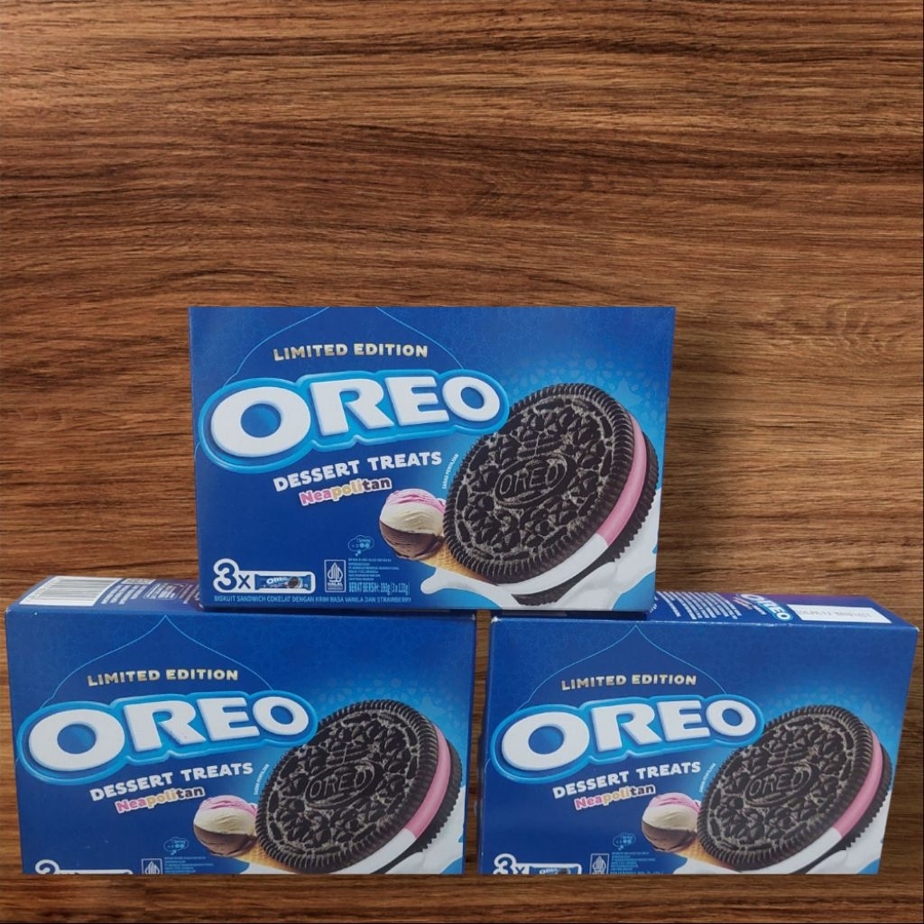 Oreo Neapolitan Dessert Treat Biskuit Krim Vanila & Stroberi 3 x 131 g adalah paket makanan ringan berupa biskuit sandwich cokelat dengan krim vanila dan stroberi.