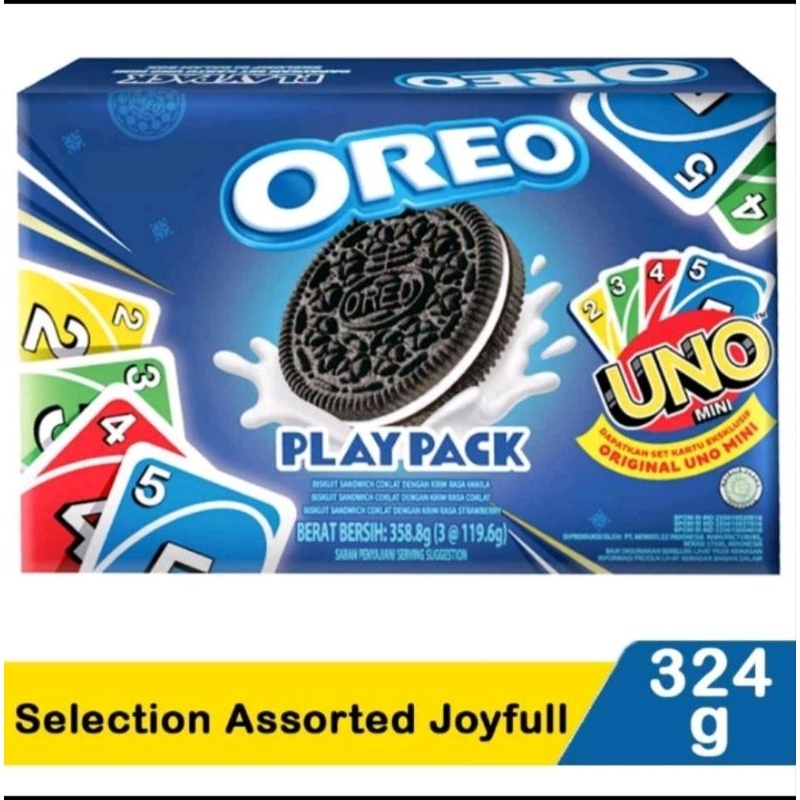 OREO Play Pack Snack Box 324 g adalah paket makanan ringan berupa beberapa jenis varian biskuit cokelat isi oreo. Dibuat menggunakan bahan bahan pilihan berkualitas dan resep rahasia yang telah melegenda, membuat biskuit ini memiliki rasa yang lezat. Biskuit cokelat isi berwarna hitam pekat dengan isian krim vanilla di antaranya, memberikan perpaduan rasa manis yang nikmat. Memiliki tekstur biskuit yang renyah dan isian krim yang creamy menghasilkan perpaduan tekstur nikmat. Dicetak dalam bentuk bulat yang pas dalam satu gigitan. Akan lebih nikmat jika dikonsumsi bersama dengan susu sebagai topping celupan untuk biskuit. Susu yang meresap kedalam biskuit semakin menambah citra rasa nikmat dari biskuit. Cocok dijadikan cemilan untuk semua kalangan, mulai dari anak anak hingga orang dewasa. Jadikan OREO Play Pack Snack Box sebagai hampers dan bingkisan andalan anda.