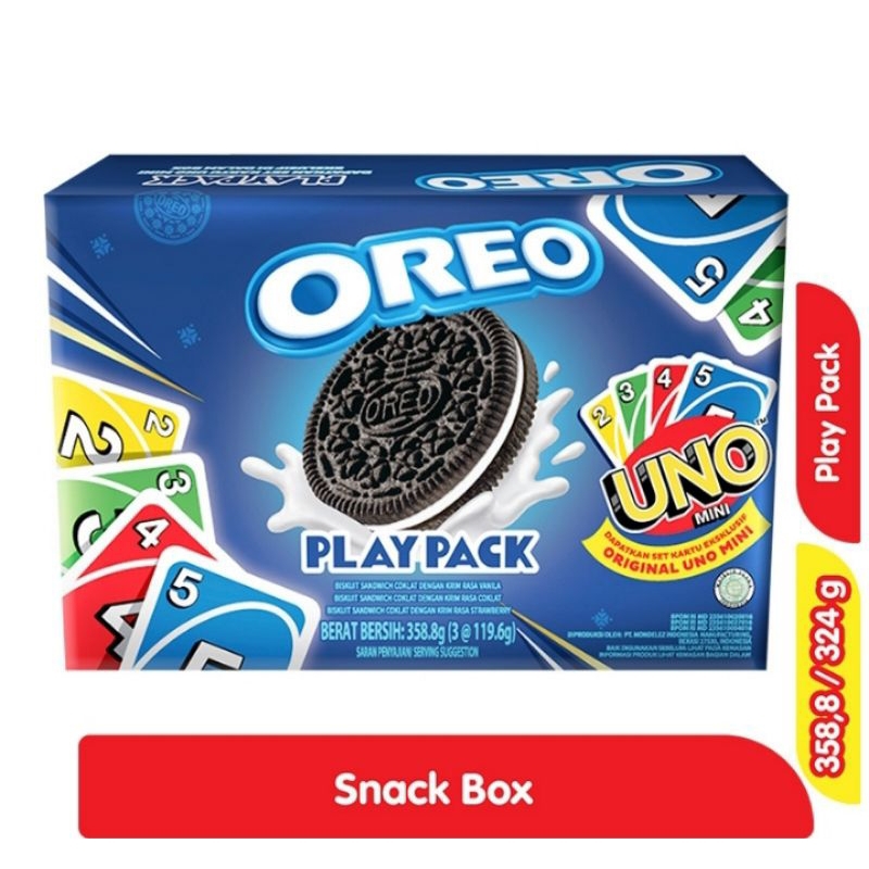 OREO Play Pack Snack Box 324 g adalah paket makanan ringan berupa beberapa jenis varian biskuit cokelat isi oreo. Dibuat menggunakan bahan bahan pilihan berkualitas dan resep rahasia yang telah melegenda, membuat biskuit ini memiliki rasa yang lezat. Biskuit cokelat isi berwarna hitam pekat dengan isian krim vanilla di antaranya, memberikan perpaduan rasa manis yang nikmat. Memiliki tekstur biskuit yang renyah dan isian krim yang creamy menghasilkan perpaduan tekstur nikmat. Dicetak dalam bentuk bulat yang pas dalam satu gigitan. Akan lebih nikmat jika dikonsumsi bersama dengan susu sebagai topping celupan untuk biskuit. Susu yang meresap kedalam biskuit semakin menambah citra rasa nikmat dari biskuit. Cocok dijadikan cemilan untuk semua kalangan, mulai dari anak anak hingga orang dewasa. Jadikan OREO Play Pack Snack Box sebagai hampers dan bingkisan andalan anda.