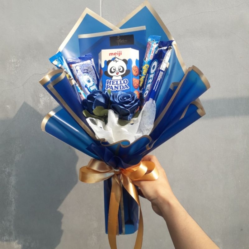 Buket berisi snack dan bunga mawar handmade ukuran medium