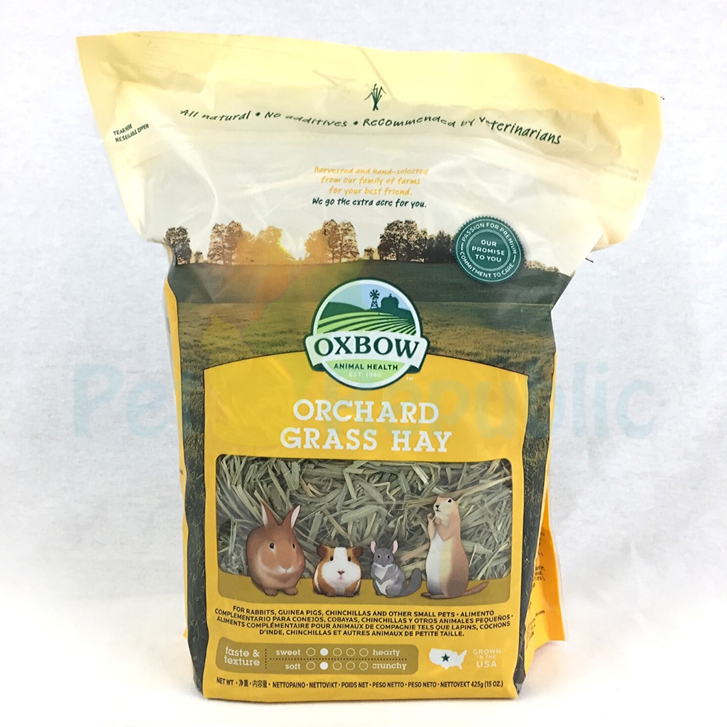 ORCHARD GRASS HAYAnimals love the sweet smell and taste of leafy Oxbow Orchard Grass Hay, and that makes it a good addition to an herbivore’s healthy meal plan. Like other long-strand grass hays, the soft-textured Orchard Grass Hay is high in fiber, low in protein and supports the health of small herbivores by stimulating digestion, preventing obesity and making mealtime more appealing. Mix Orchard Grass Hay with other Oxbow grass hays to create a sweet and nutritious combination.Ingredients100% Orchard Grass Preservative and Additive Free. Loose hay contains stems, leaves, and limited seed heads.Guaranteed AnalysisCrude Protein min 7.00%Crude Fat min 1.50%Crude Fiber max 32.00%Moisture max 15.00%