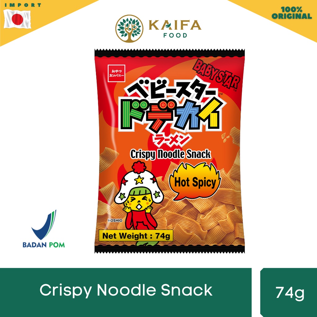 OYATSU BABY STAR SNACK MIE LEBAR RASA HOT & SPICY 74 gr merupakan snack mie kering yang berbentuk lebar, kriuk dan sudah berbumbu, tanpa perlu repot repot untuk mencampur dan mengocok bumbu yang terpisah, dan langsung bisa konsumsi, namun tak melupakan kelezatannya buat selingan ngemil dikala senggang, tua muda menyukainya dengan rasa gurih dan yang pasti enak banget!