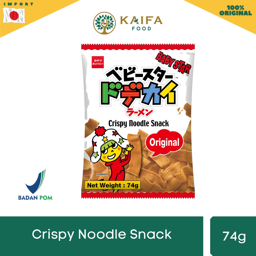 OYATSU BABY STAR CRISPY WIDE NOODLE SNACK ORIGINAL FLAVOUR 74gr merupakan mie kering yang berbentuk lebar, kriuk dan sudah berbumbu, tanpa perlu repot repot untuk mencampur dan mengocok bumbu yang terpisah, dan langsung bisa konsumsi, namun tak melupakan kelezatannya buat selingan ngemil dikala senggang, tua muda menyukainya dengan rasa gurih dan yang pasti enak banget!