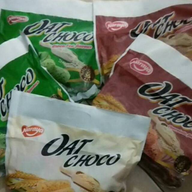 Camilan oat choco tersedia dalam pilihan rasa : coklat , vanilla, green tea .