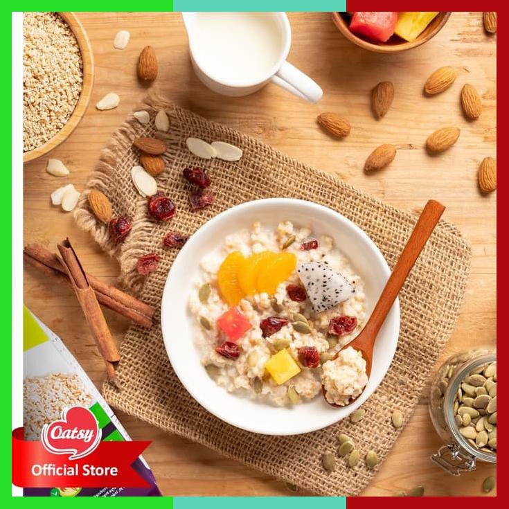 1. Di atas api kecil - masukkan 4 sendok penuh Oatsy (30g) ke dalam panci, tuang 300ml air atau susu dan masak selama 10-20 menit sambil sesekali diaduk, hingga mendapatkan tekstur yang disukai. Bisa disajikan dengan tambahan buah kering atau kacang seperti kismis, almond atau walnut.