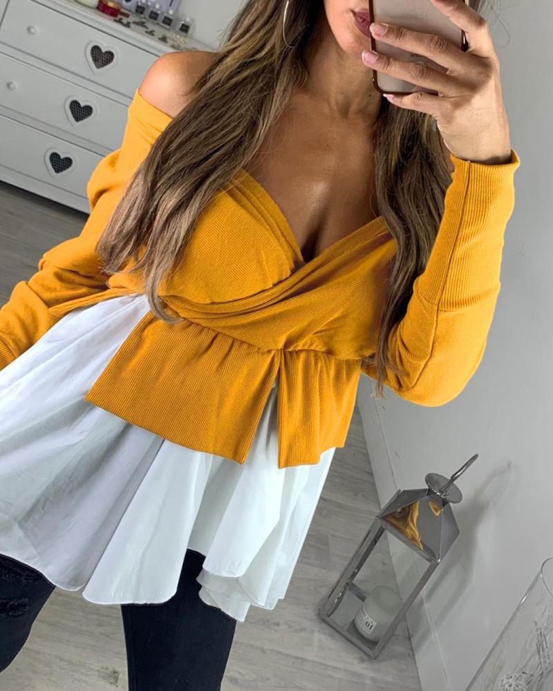 Off Shoulder Batwing Sleeve Colorblock Insert Ruffles Blouse, Yellow