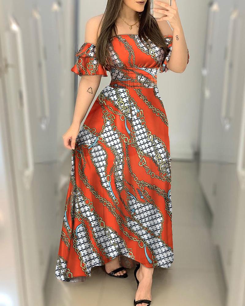 Off Shoulder Chain Print Colorblock Ruffles Maxi Dress, Orange