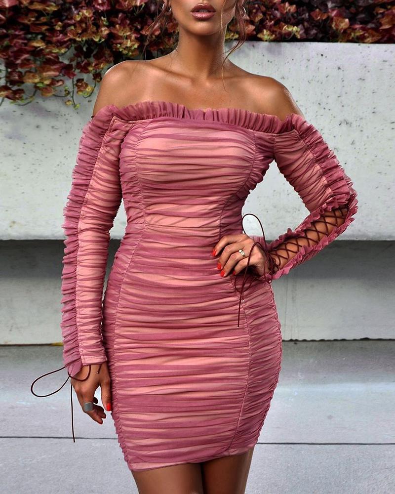 Off Shoulder Frill Design Lace--up Ruched Bodycon Dress