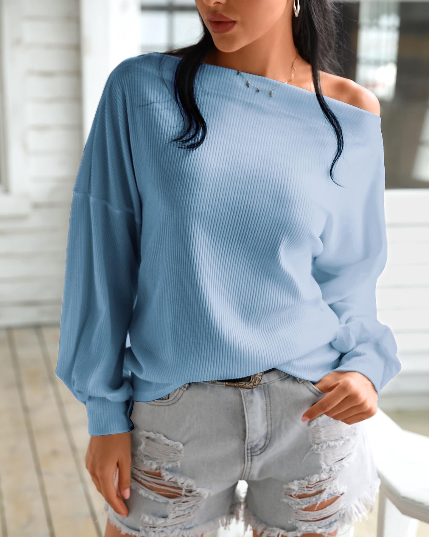 Off Shoulder Lantern Sleeve Ribbed Sweater, Blue