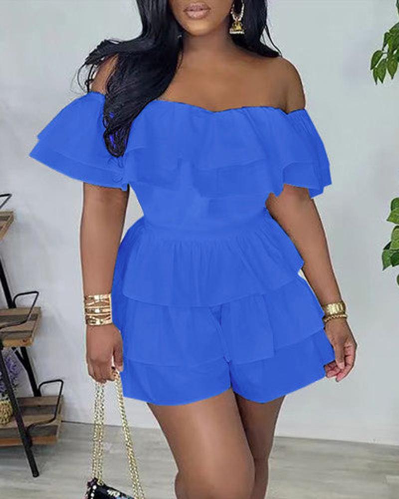 Off Shoulder Layered Ruffles Romper, Blue