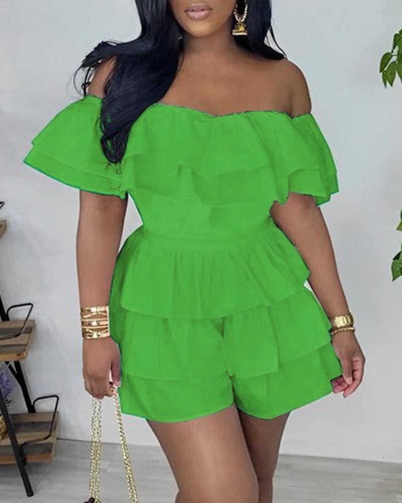 Off Shoulder Layered Ruffles Romper, Green