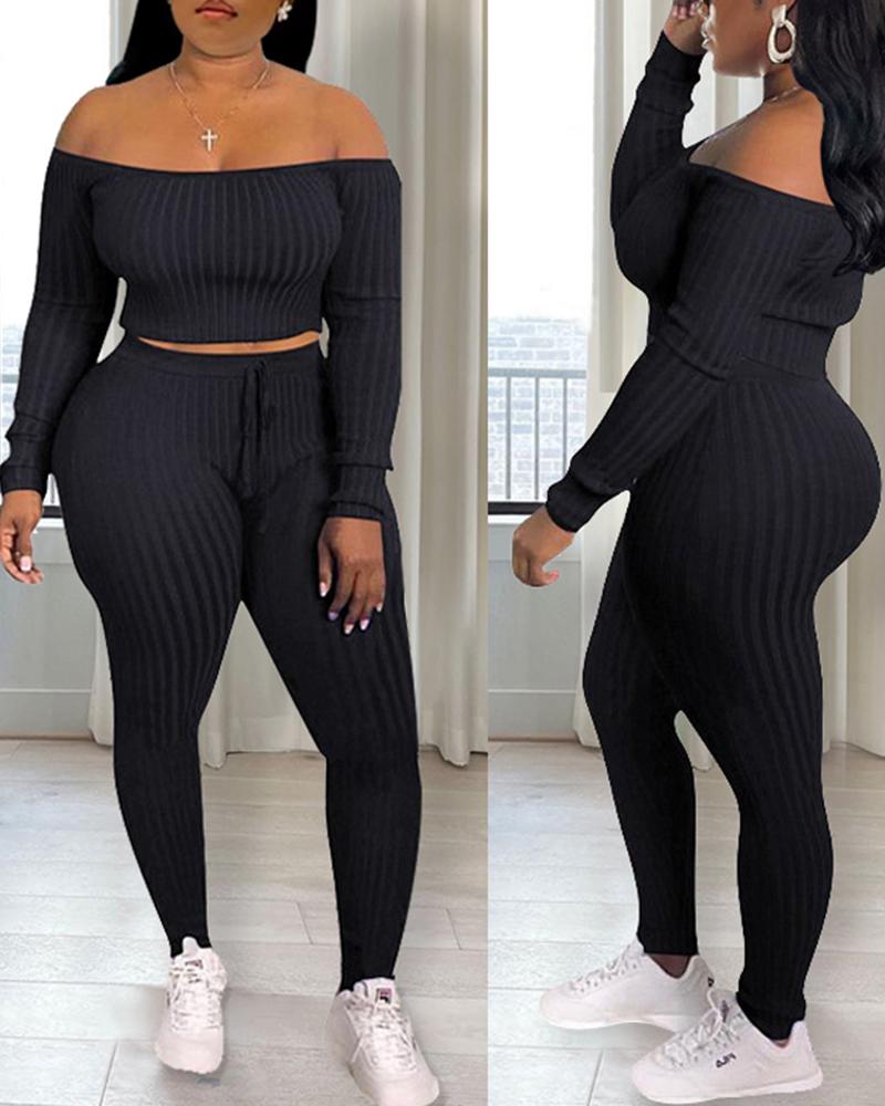Off Shoulder Ribbed Crop Top & Drawstring Pants Set, Black