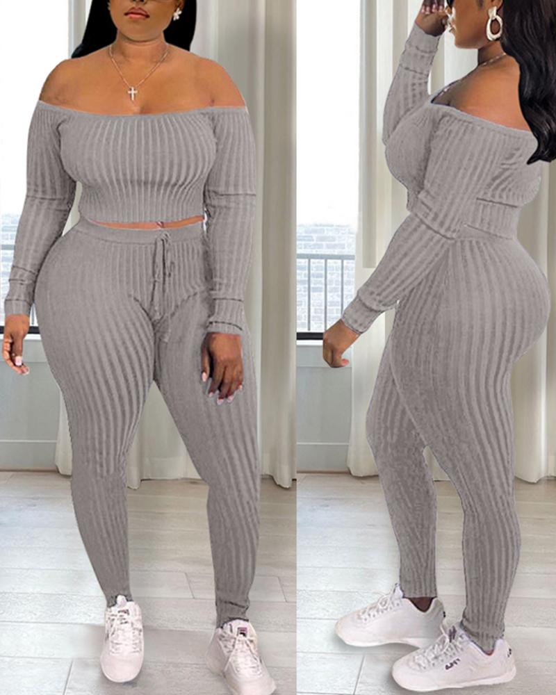 Off Shoulder Ribbed Crop Top & Drawstring Pants Set, Blue