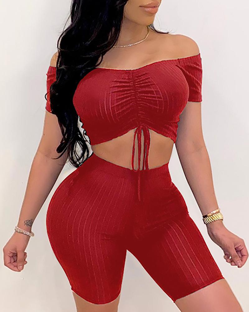 Off Shoulder Ribbed Drawstring Top & Shorts Set, Red