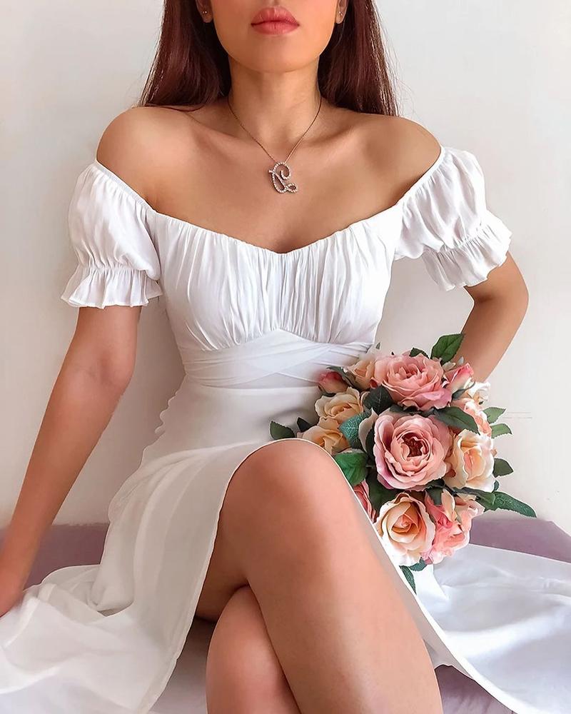 Off Shoulder Ruched Ruffles Dress, White