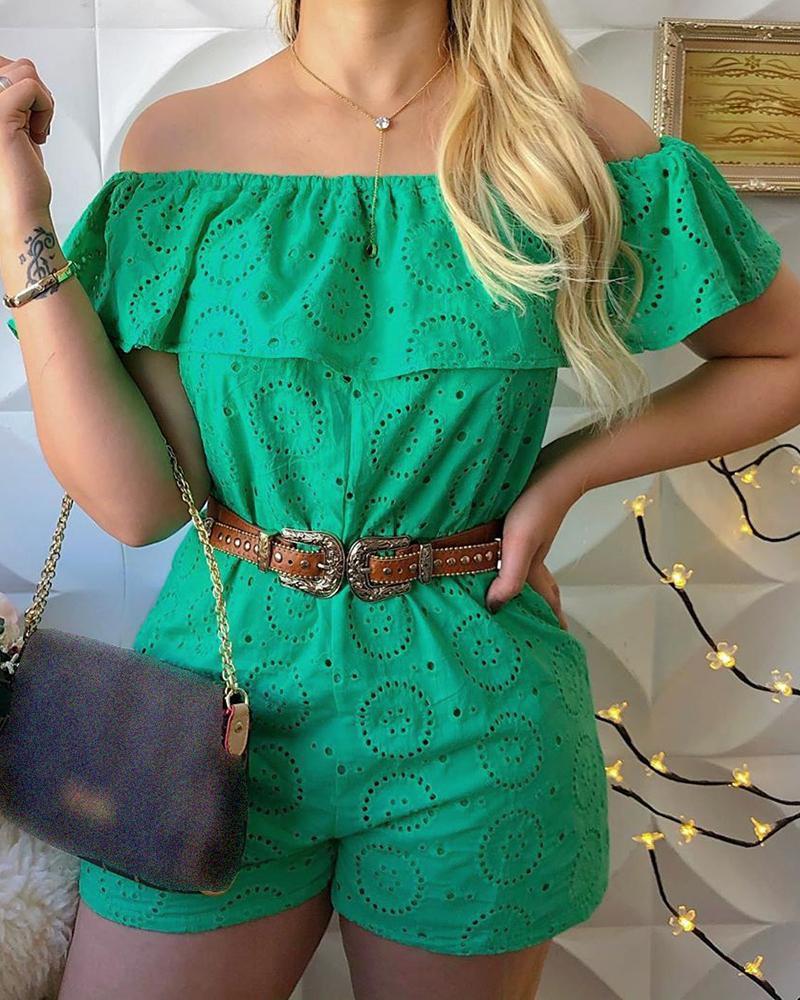 Off Shoulder Ruffles Broderie Lace Romper, Green